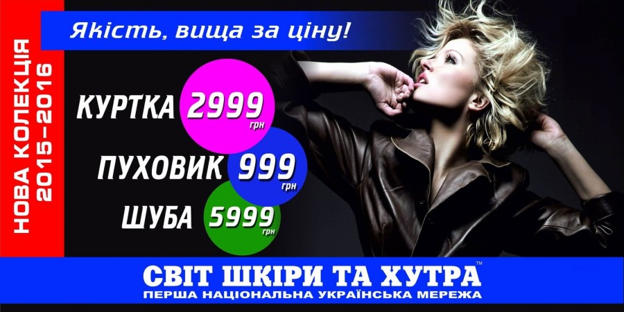Поспішаємо вам повідомити, що нова колекція верхнього одягу сезону осінь-зима 2015-2016 вже у продажу! Відвідайте магазин «Світ шкіри та хутра», де вас приємно здивує широкий асортимент товару: шуби и жилети з натурального хутра норки, мутона, астрагала, орілага, бобра, ондатри, нутрії, песця, куниці, чорнобурої і рудої лисиці, стильні і яскраві шкіряні куртки і френчі, вовняні, кашемірові і текстильні пальто, пуховики, вітровки, головні убори, сумки та аксесуари.
