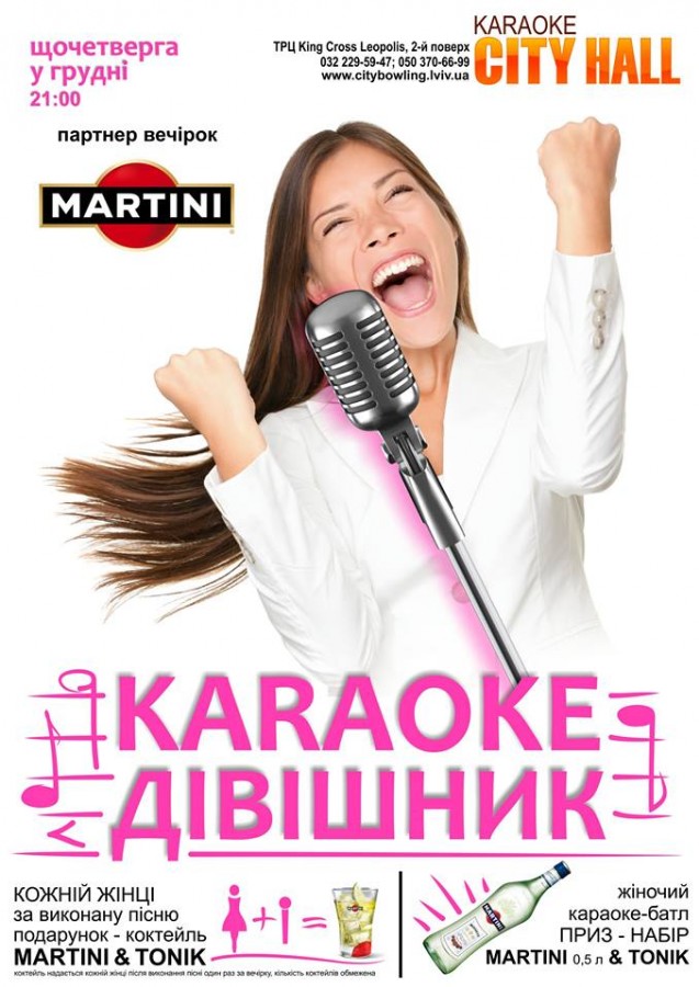 Кожній жінці за виконану пісню - коктейль Мартіні-тонік в подарунок. А за перемогу у караоке-батлі - Набір Мартіні 0,5л+Тонік.