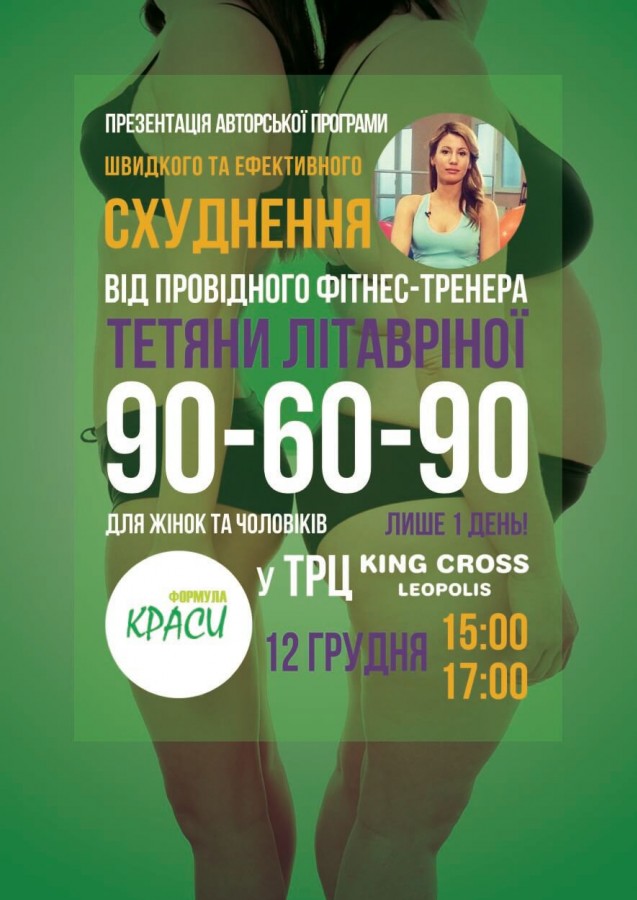 On December 12, 2015, King Cross Leopolis invites everyone for the presentation of a rapid weight loss program "90-60-90" developed for men and women by Tetiana Litavrina, a leading fitness instructor.