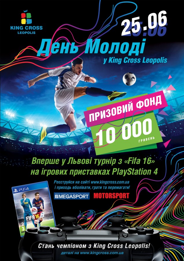 King Cross Leopolis organizes a real football celebration! On June 25, 2016 especially for the Youth Day – the first Playstation tournament “FIFA 16” in Lviv. The prize fund – 10 000 UAH!!! It is worth competing! Register on our website www.kingcross.com.ua and come to King Cross Leopolis to play, win or cheer for your favorite team!