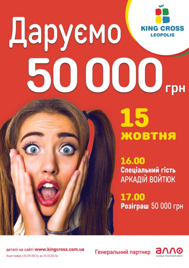 З 1 вересня до 15 жовтня беріть участь у грандіозному розіграші 50 000 гривень на шопінг! Для участі потрібно здійснити покупку на 600 грн (одним чеком) у будь-якому магазині та пред'явити чек і покупку на промостійці.