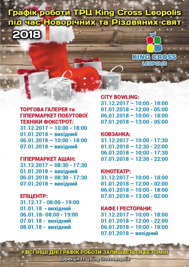 Графік роботи ТРЦ King Cross Leopolis під час Новорічних та Різдвяних свят 2018
