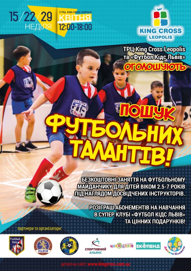 15, 22 та 29 квітня відбудуться безкоштовні заняття на футбольному майданчику для дітей віком 2,5-7 років. На учасників чекають суперподарунки - абонементи на навчання в "Футбол Кідс Клубі" та інші цінні подарунки!
