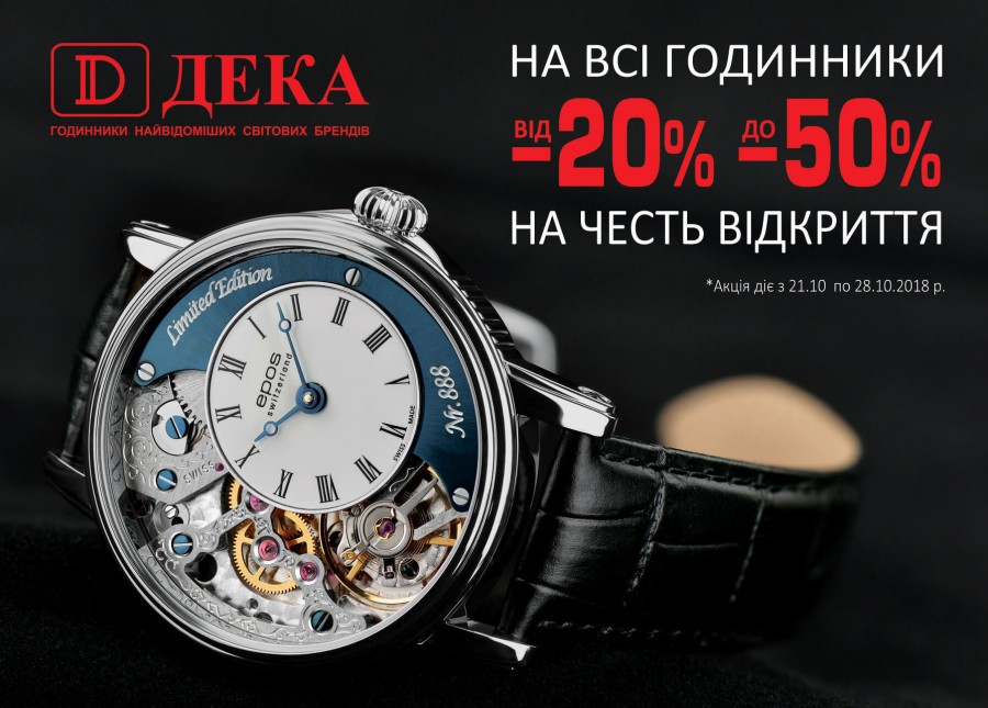 На честь відкриття ДЕКА дарує амбітні знижки від 20% до 50% на годинники з 21 по 28 жовтня*. Більше того, перші десять покупців отримають приємні подарунки!