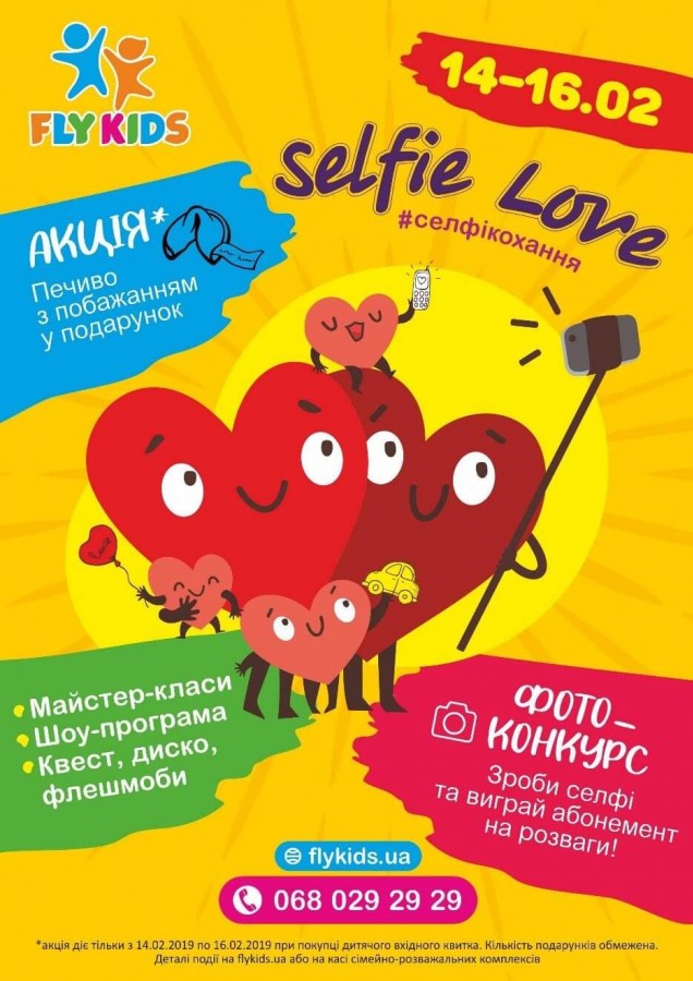 Любі друзі! Мережа сімейно-розважальних комплексів Fly Kids запрошує відсвяткувати День Закоханих. З 14 по 16 лютого 2019 року наші відвідувачі, які придбали дитячі браслети для входу, можуть отримати печиво з побажанням у подарунок. Кількість подарунків обмежена! Також на вас чекають цікаві майстер-класи, квест, конкурсно-розважальна програма та багато інших активностей. А на нашій сторінці в Instagram ми проведемо фотоконкурс, у якому зможуть взяти участь відвідувачі, які зроблять фото у наших нових фотозонах. За умовами фотоконкурсу буде потрібно: зробити фото в одній з наших фотозон, опублікувати його у своєму Instagram акаунті з хештегом #flykids, відмітити одного друга у коментарі під відповідним дописом, який з’явиться на на сторінці 14 лютого 2019 року. Умови розіграшу можна виконати до 20.02.2019!