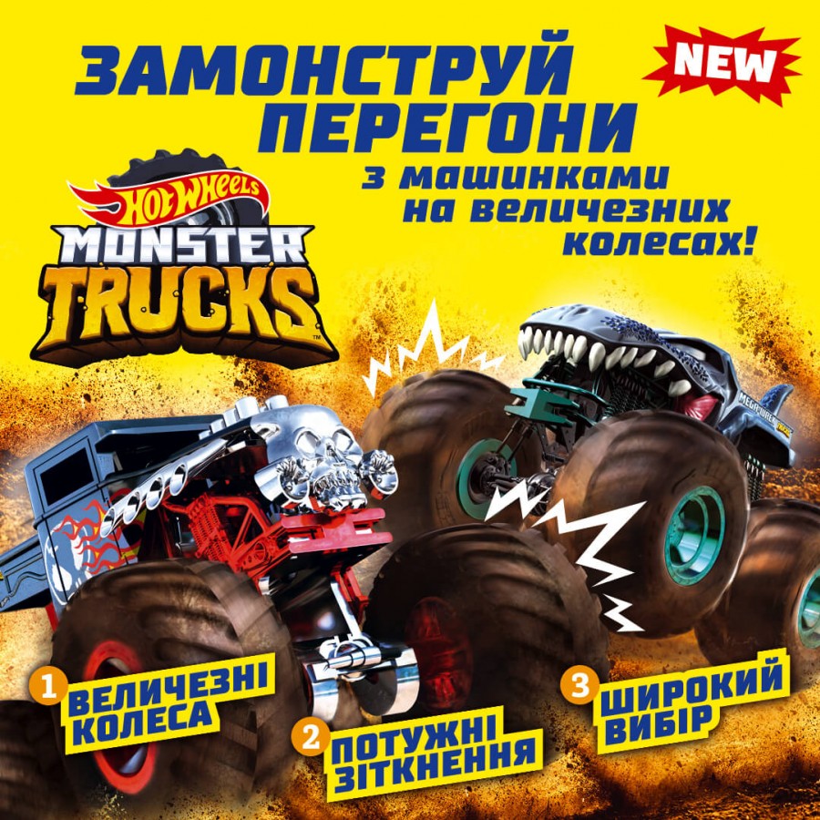 Зустрічай машинки-позашляховики нової серії Hot Wheels – «Monster Trucks», які створені лише для перемоги!