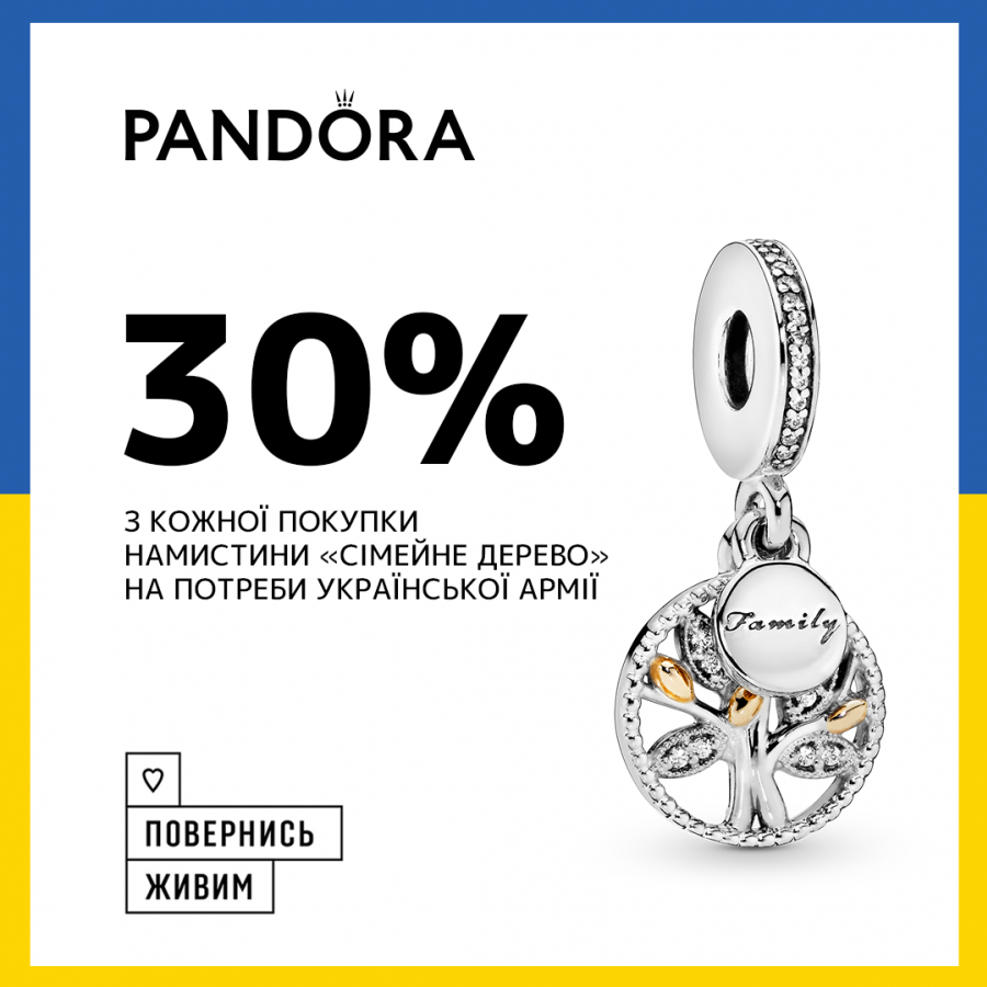 Зараз команда бренду продовжує підтримувати захисників. Як офіційний дистриб’ютор виробів Pandora в Україні, вони будуть перераховувати 30% з кожної проданої намистини «Сімейне дерево» (арт. 791728CZ) до благодійного фонду.