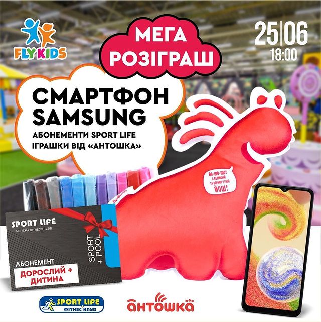 Розіграш відбудеться 25.06 о 18:00 на головній сцені FLY KIDS. Учасник має бути присутній з дитиною у комплексі на момент розіграшу.