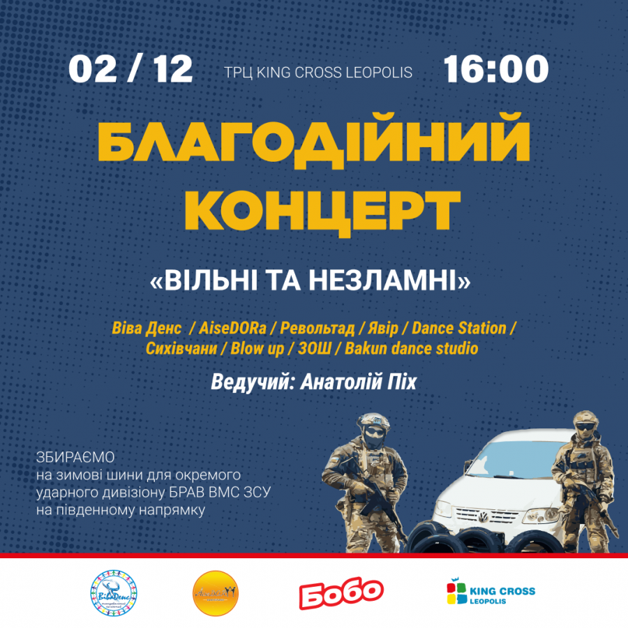 «Вільні та незламні» — концерт, під час якого відбуватиметься збір коштів на зимові шини для ударного дивізіону БРАВ ВМС ЗСУ. Навіть під час відпочинку не слід забувати про обовʼязок допомагати хлопцям та дівчатам, що боронять наш з вами спокій.