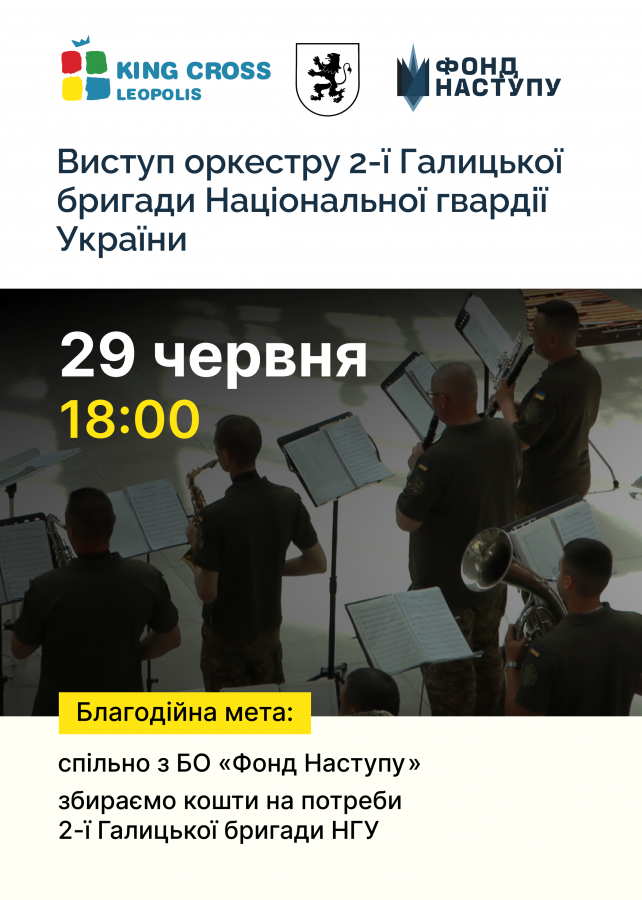 На вас чекає виступ оркестру 2-ї Галицької бригади Національної гвардії України — подія, що об’єднує силу музики та силу допомоги! Приходьте підтримати наших захисників і наповнити недільний вечір щирими емоціями.