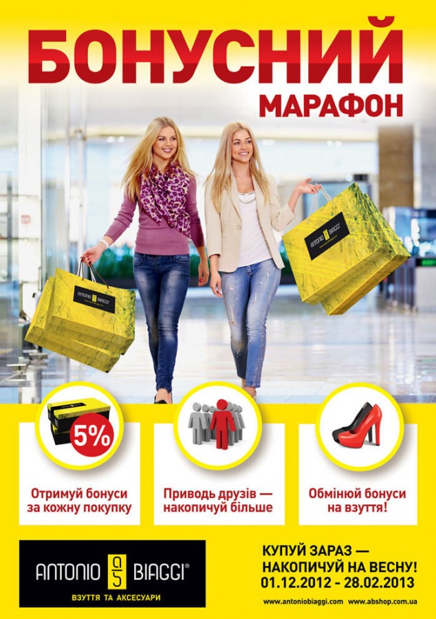 Antonio Biaggi оголошує про початок "Бонусного марафону»! Тільки три місяці з 1 грудня 2012 до 28 лютого 2013, крім знижок ви додатково отримуєте грошове винагородження у вигляді бонусів за здійснені покупки.