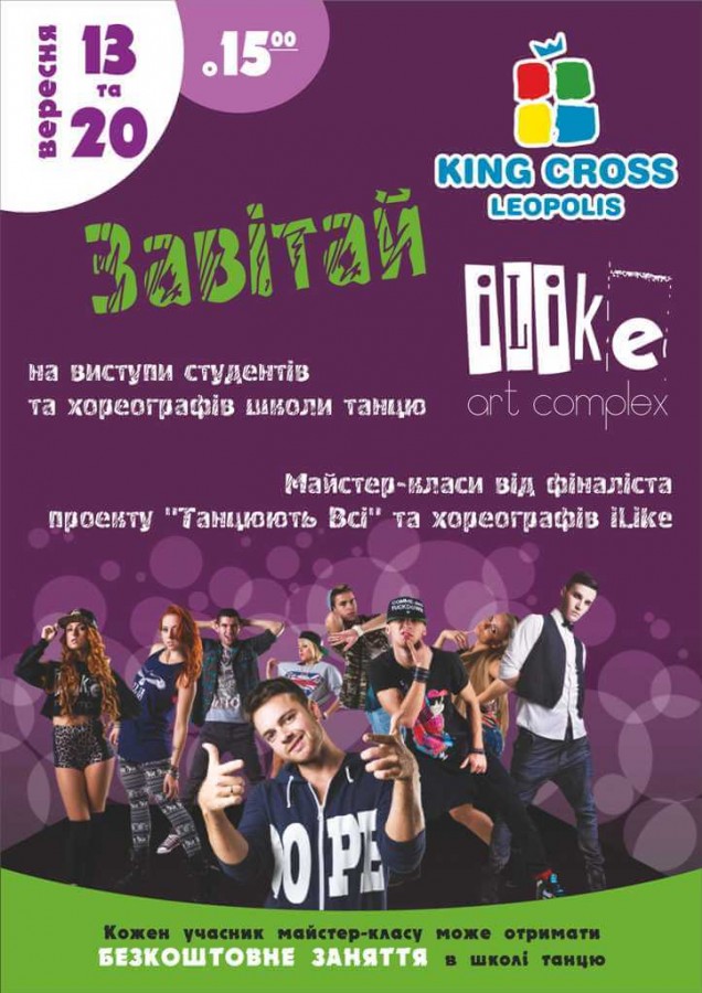 У вересні: 13 та 20 вересня о 15.00 завітай на виступ студентів та хореографів школи танцю ILike Art Complex у ТРЦ King Cross Leopolis. Майстер-класи від фіналіста проекту "Танцюють всі" та хореографа ILike.Кожен учасник може отримати безкоштовне заняття в школі танцю. 14,21 та 28 вересня о 15.00 приходь на безкоштовні майстекласи по дереву та склу. Будемо вирізати, різьбити, свердлити та декорувати. В програмі веселі конкурси та розіграші подарунків.