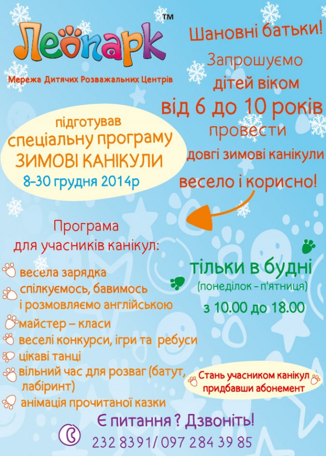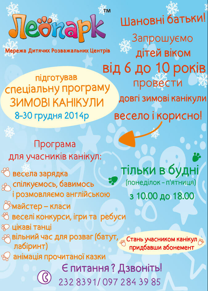 Шановні батьки! ДРЦ "Леопарк" підготував для дітей віком від 6 до 10 років супер пропозицію "ЗИМОВІ КАНІКУЛИ". З 8-30 грудня 2014 р. діти зможуть корисно провести час.