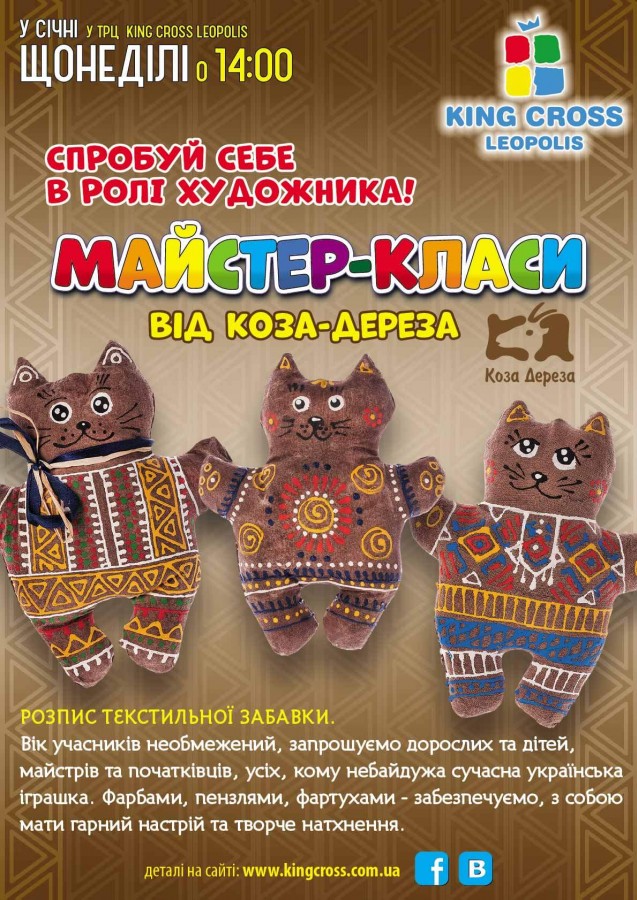 Щонеділі у січні, завітайте у ТРЦ King Cross Leopolis на безкоштовні майстер-класи від "Коза Дереза". У програмі: - Розпис текстильної забавки.