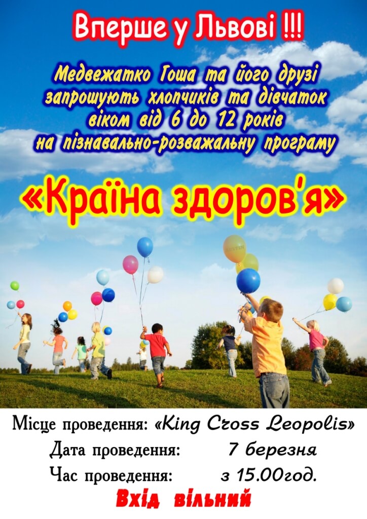 7 березня 15:00 Медвежатко Гоша та його друзі запрошують хлопциків та дівчаток віком від 6 до 12 років на пізнавально-розважальну програму "Країна здоров'я". Вхід вільний