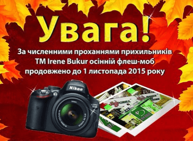 З радістю вам повідомляємо, що #irenebukurFlashmob продовжується! За численними проханнями прихильників та зверненнями дописувачів, команда Irene Bukur вирішила продовжити флеш-моб до 1 листопада 2015 року!