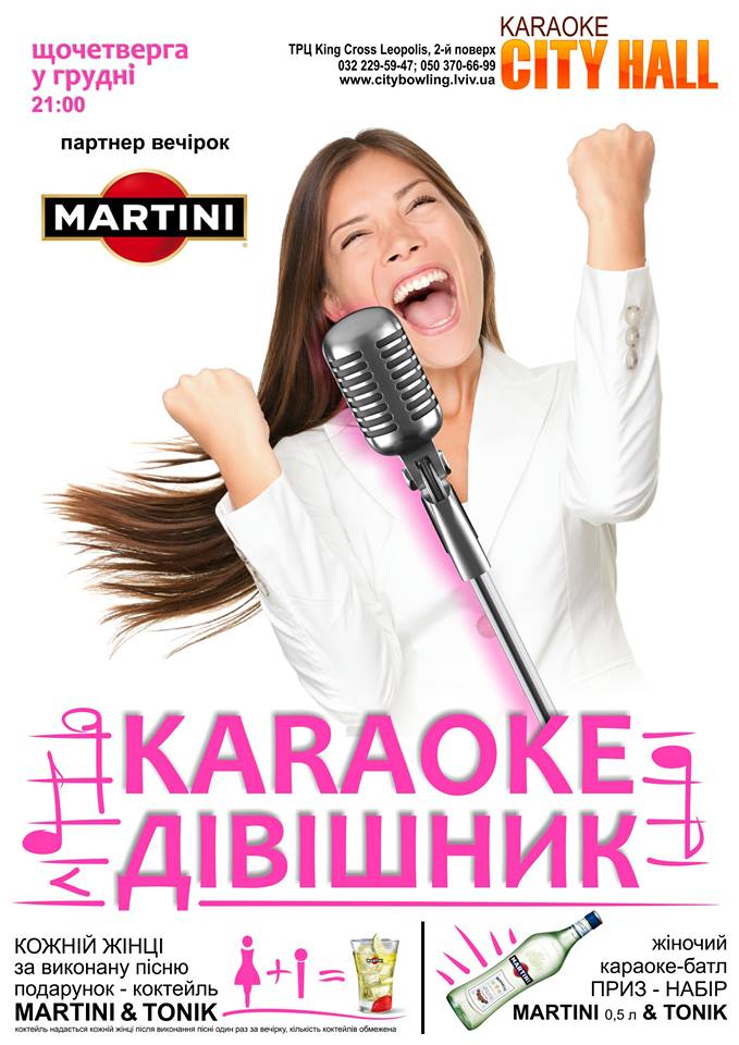 Кожній жінці за виконану пісню - коктейль Мартіні-тонік в подарунок. А за перемогу у караоке-батлі - Набір Мартіні 0,5л+Тонік.