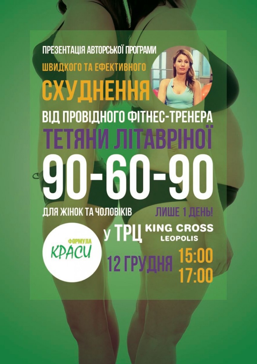12 грудня у ТРЦ King Cross Leopolis пройде презентація авторської програми швидкого та ефективного схуднення від провідного фітнес тренера Тетяни Літавріної "90-60-90" для жінок та чоловіків.
