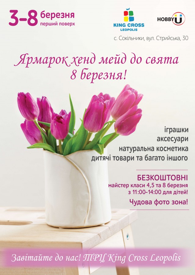 Також під час ярмарку триватимуть безкоштовні майстер-класи для дітей та буде можливість зробити чудові весняні фото біля фотозони.
