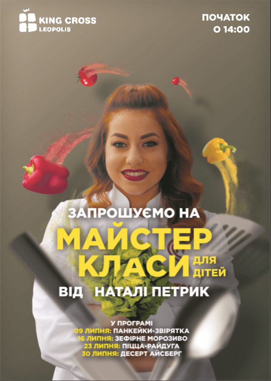 Щонеділі в липні опановуйте з Вашими дітками нові грані в кулінарії! Учасниця проекту "Мастер-шеф" Наталя Петрик проведе майстер-класи для дітей, де готуватиме з ними панкейки-звірятка, зефірне-морозиво, піцу і найсмачніший десерт! Все це - у ТРЦ King Cross Leopolis. Запрошуємо!