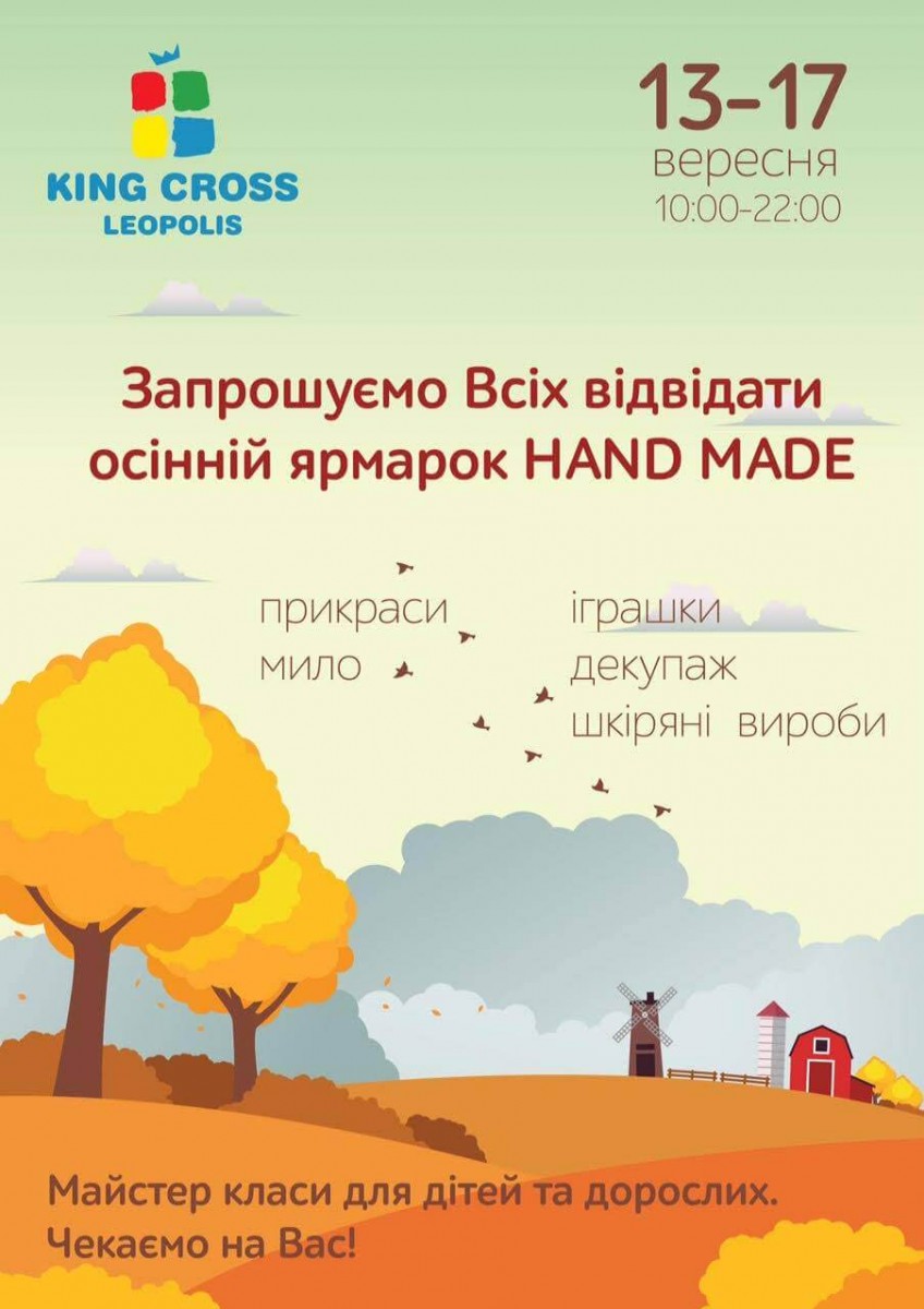 Осінній ярмарок hand-made у ТРЦ King Leopolis! Шкіряні вироби та іграшки, засоби догляду та прикраси - все це зустрінете на майстер-класах. Всього 4 дні - з 13 до 17 вересня. Запрошуємо!