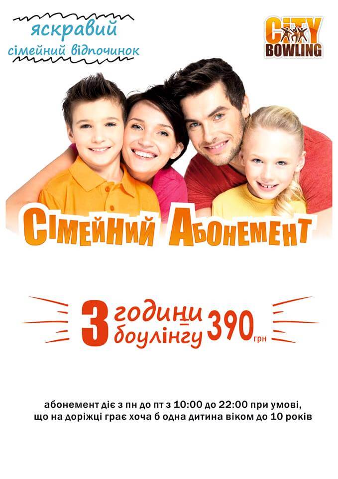 Боулінг - це справжня сімейна гра, не сумнівайтесь. Приходьте до нас разом з рідними та отримуйте три години боулінгу всього за 390 грн! Акційний абономент діятиме 10:00 до 22:00, за умови, якщо з вами на доріжці гратиме мінімум одна дитина(віком до 10років).