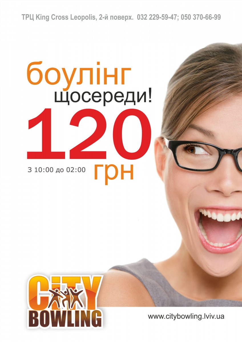 Щосереди для всіх відвідувачів City Bowling діє спеціальна ціна - година гри всього за 120 грн! Акція діє з 10:00 до 2:00.