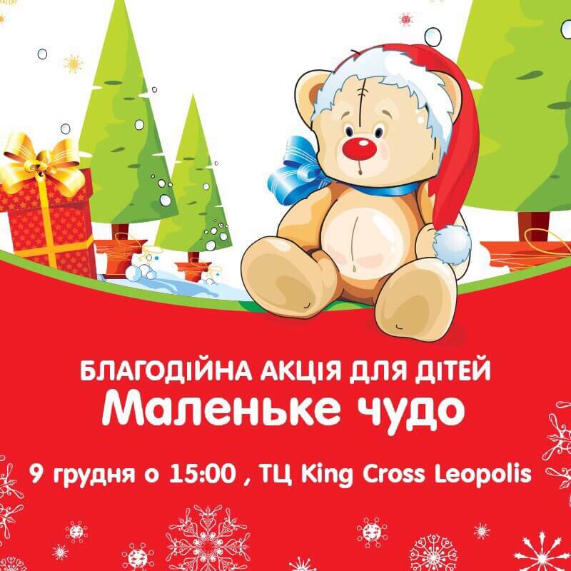 9 грудня о 15:00,в ТРЦ King Cross Leopolis відбудеться Благодійна акція для дітей, які позбавлені батьківської любові та родинного тепла. Запрошуємо всіх охочих подарувати дітям маленьке диво!
