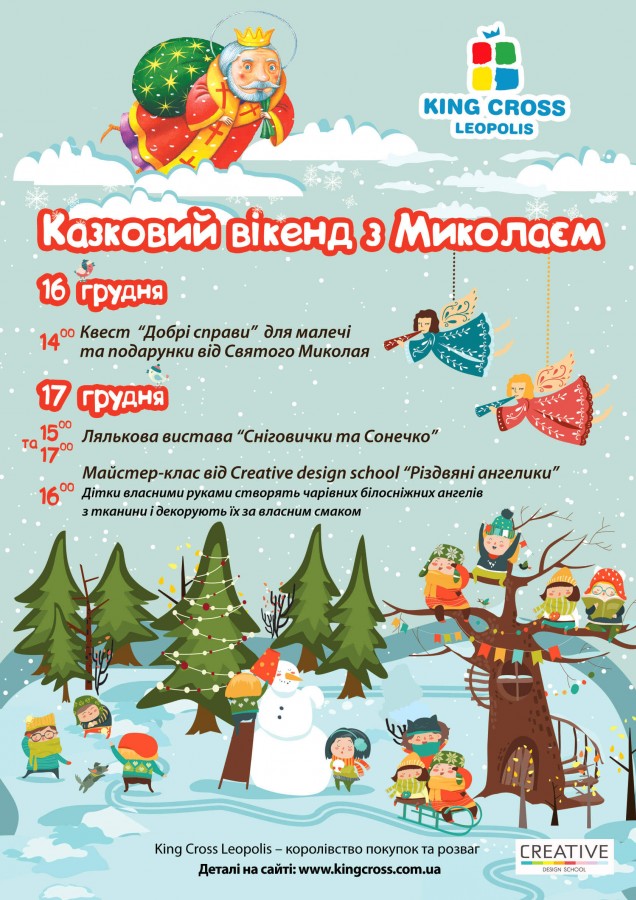 17 грудня запрошуємо на лялькову виставу "Сніговички та сонечко" - о 15:00 та 17:00. А вже о 16:00 - майстер-клас від Creative design school, де всі охочі зможуть спробувати себе у створенні Різдвяних ангеликів.