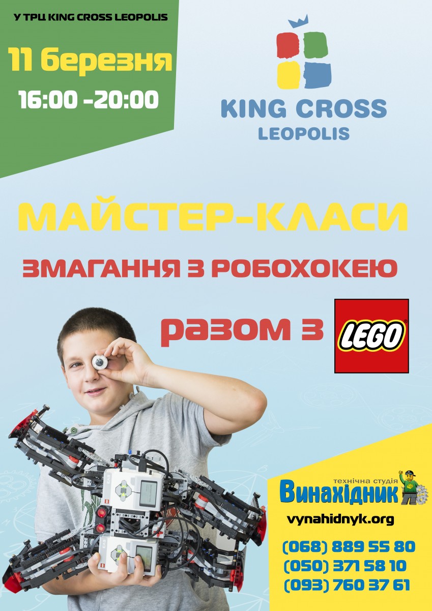 Запрошуємо на майстер-класи Lego 4 та 11 березня від студії "Винахідник". Приходьте до King Cross Leopolis з 14:00 до 18:00.Учасники зможуть взяти участь у захопливих змаганнях із робохокею!