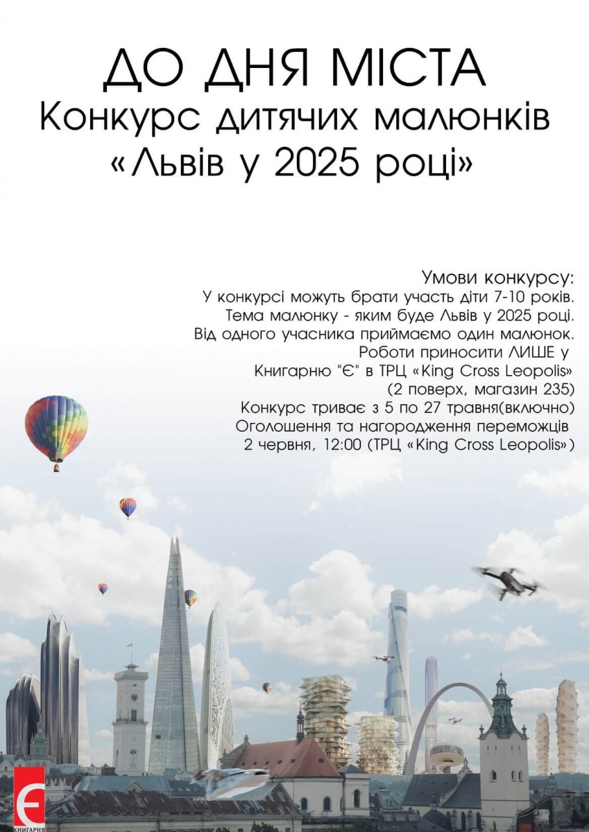 З нагоди дня народження Львова книгарня «Є» оголошує конкурс дитячого малюнку «Львів у 2025 році».
