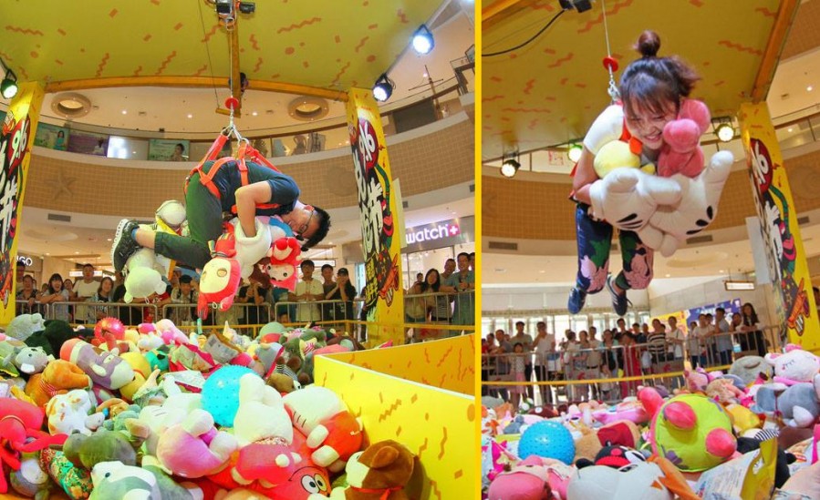 Учасники атракціону "Призолов" кріпляться на спеціальну конструкцію та в підвішеному стані витягують подарунок з басейну.