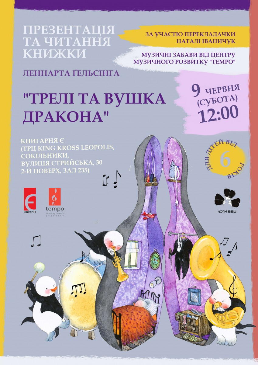 Книгарня «Є» спільно з видавництвом Видавництво 21 та Центр музичного розвитку "Tempo" запрошує дітей та їхніх батьків на презентацію книжки Леннарта Ґельсінга «Трелі та вушка дракона».