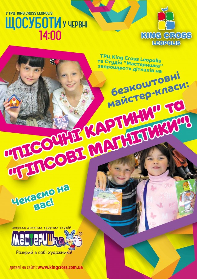 ТРЦ King Cross Leopolis та Студія "Мастеришка" запрошують дітлахів на безкоштовні майстер-класи: "Пісочні картини" та "Гіпсові магнітики"!