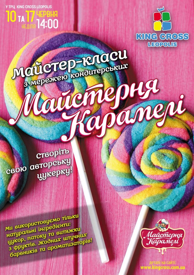 Хто в дитинстві не мріяв створити свою велику і смачну цукерку?10 та 17 червня запрошуємо всіх ласунів на майстер-класи з мережею кондитерських Майстерня Карамелі! Використовуємо лише натуральні інгредієнти