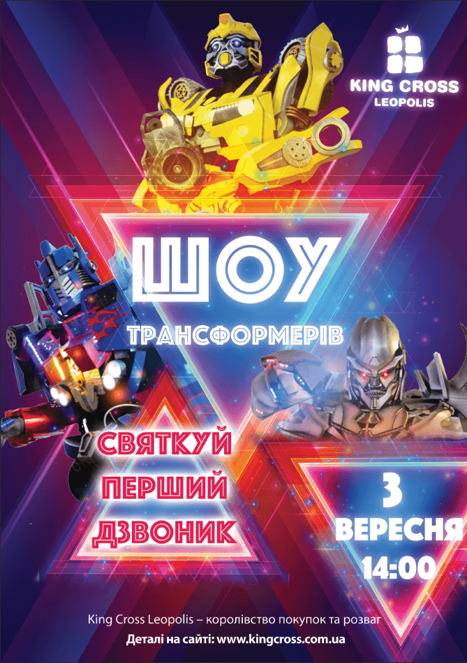 Свято першого дзвінка з King Cross Leopolis буде драйвовим! 3 вересня запрошуємо всіх школярів на шоу трансформерів. Стрільба з бластерів, справжні бої роботів - ти будеш в захопленні!
