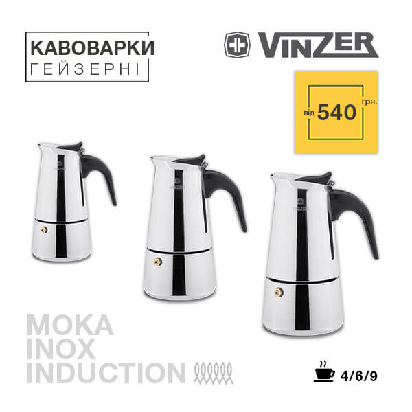 На вас чекає приємна ціна від 540 грн на стильні гейзерні кавоварки VINZER Moka Inox Induction для індукційних плит!