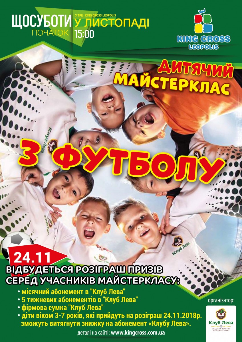 Спорт - важлива складова здорового способу життя для дорослих та дітей. Щосуботи у листопаді запрошуємо на дитячі майстер-класи з футболу від "Клуб Лева"!