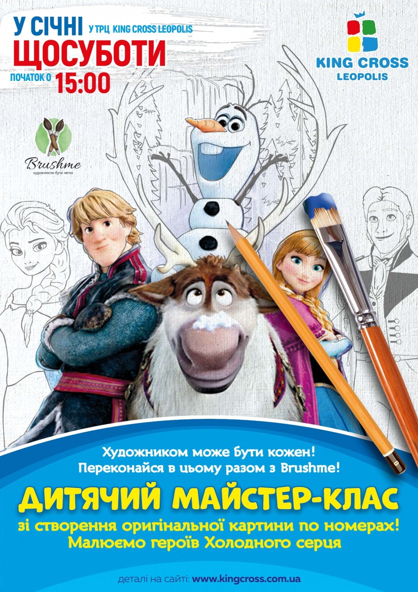 Художником може бути кожен! Переконайся в цьому разом з Brushme! Дитячий майстер-клас зі створення оригінальної картини по номерах! Малюємо героїв "Холодного серця". Майстер-класи відбуватимуться щосуботи у січні. Початок - о 15:00.