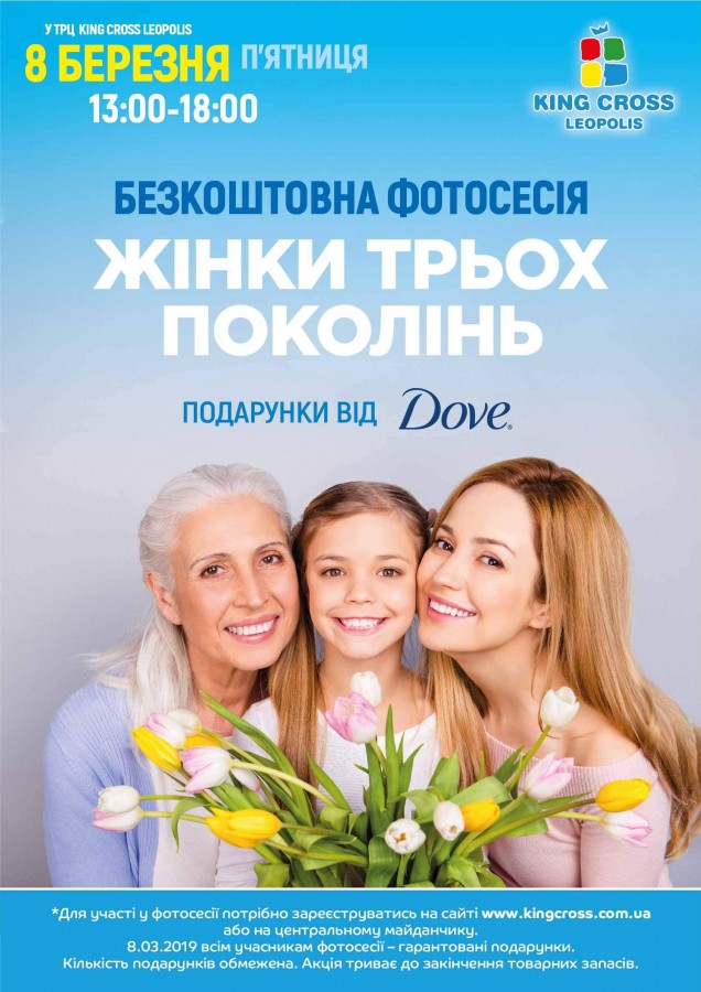 Весна - пора краси і жіночності. Ми віримо, що бути справжньою жінкою можна в будь-якому віці, тож запрошуємо взяти участь в фотосесії "Жінки трьох поколінь"! Участь можуть брати мами з доньками, бабусі з внучками або ж три покоління - бабуся, мама і донька. Окрім фото, всі учасниці отримають 8 березня подарунки від DOVE*!