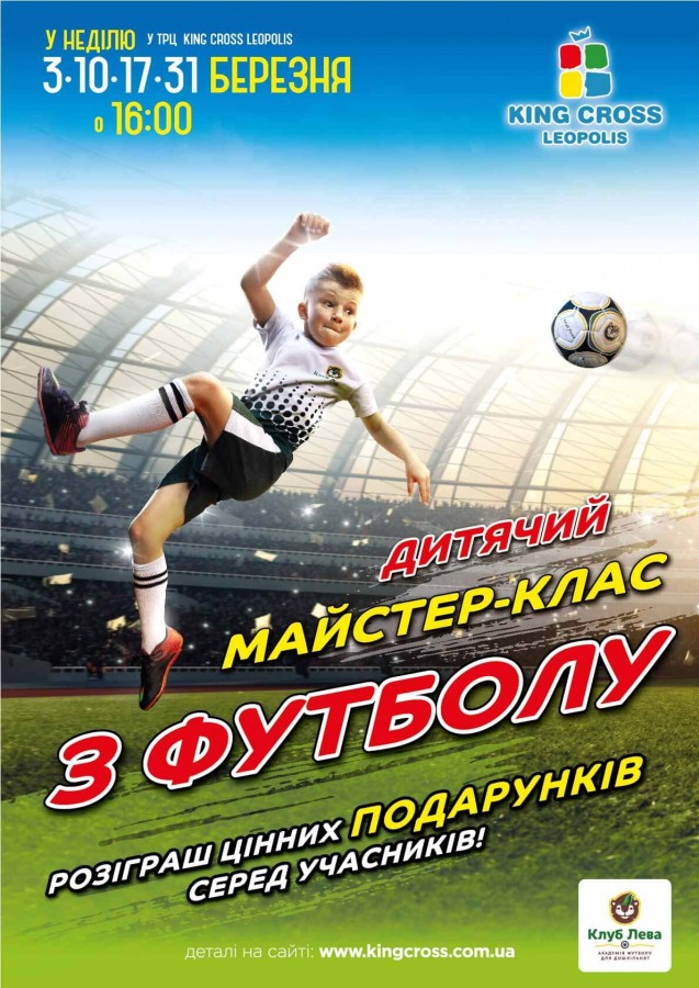 Щонеділі у березні запрошуємо на дитячі майстер-класи з футболу від Клубу Лева! Діти зможуть навчитися різних ударів, футбольних комбінацій, а також взяти участь у розіграші цінних подарунків.