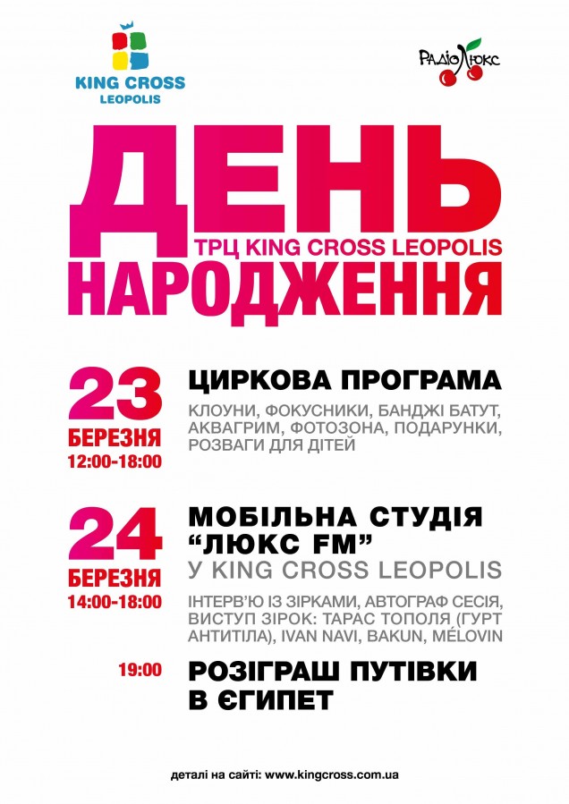 24 березня у ТРЦ King Cross Leopolis завітають ведучі Люкс ФМ - Nazar Biychuk, Diana Lutsyshyn, Лана Квітнева, Тарас Вишня, Andriy Fertsak! Разом з відвідувачами вони зустрінуть у мобільній студії зіркових гостей: Тараса Тополю, Ivan Navi, Bakun та Melovin! Після інтерв'ю усі шанувальники зможуть поспілкуватися з виконавцями на автограф-сесії та почути улюблені пісні. Початок заходів о 14:00.
