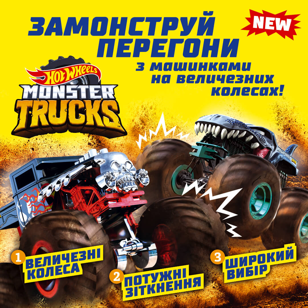 Зустрічай машинки-позашляховики нової серії Hot Wheels – «Monster Trucks», які створені лише для перемоги!