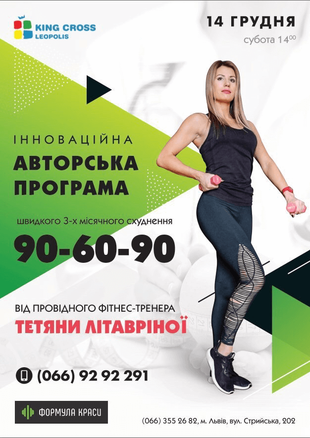 14 грудня Тетяна Літавріна презентуватиме інноваційну авторську програму зі швидкого 3-місячного схуднення "90-60-90"! Провідна фітнес-тренерка розповість  про ефективні методи боротьби з зайвою вагою, способи підтримки форми та як займатись спортом із задоволенням!