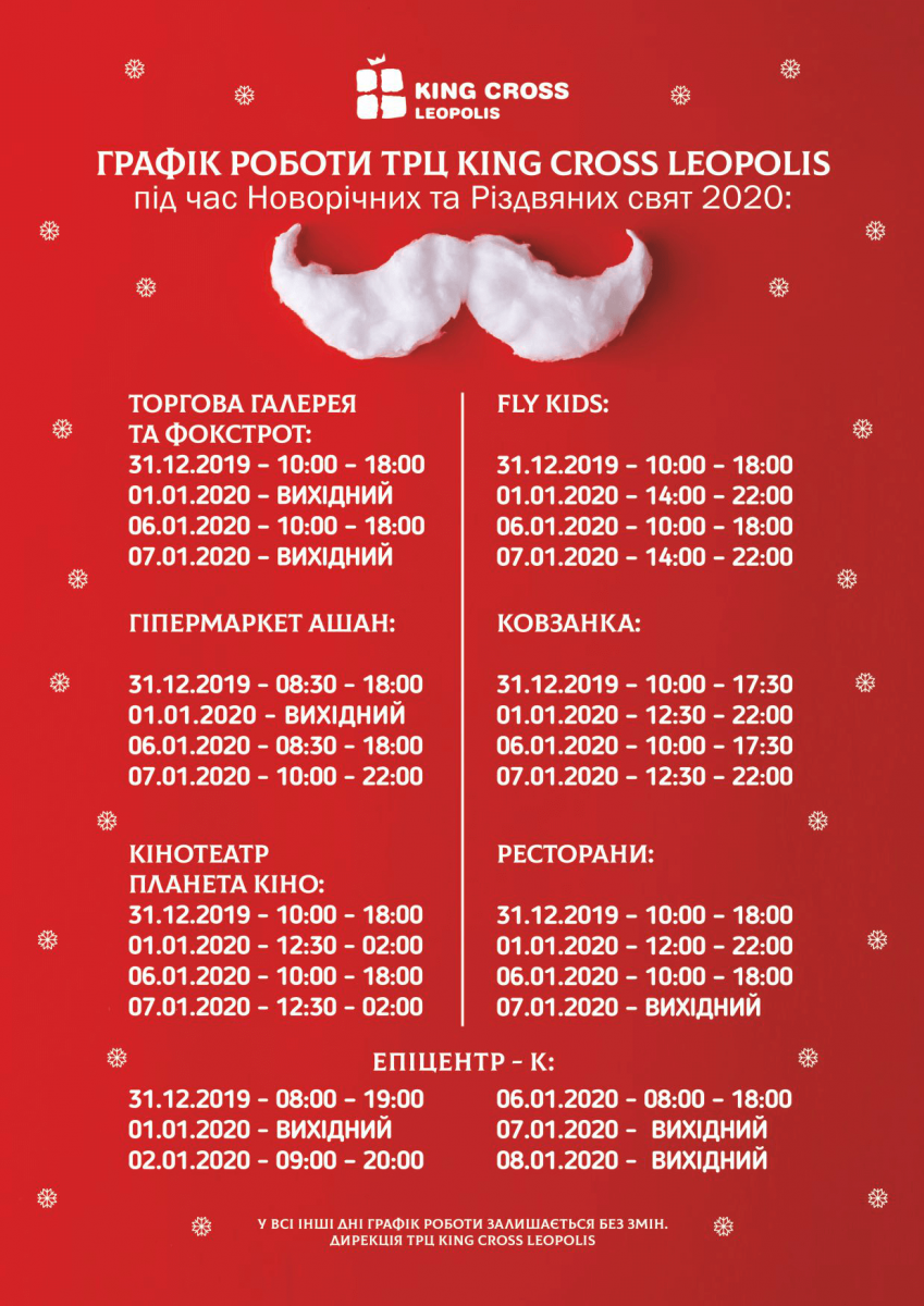 Графік роботи торгової галереї та закладів ТРЦ King Cross Leopolis на час зимових свят зміниться. Зберігайте оновлений графік для святкового шопінгу!