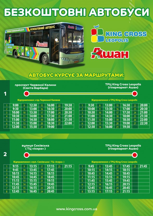 Від сьогодні ТРЦ King Cross Leopolis працює до 21:00, тож графік руху безкоштовних автобусів змінено: