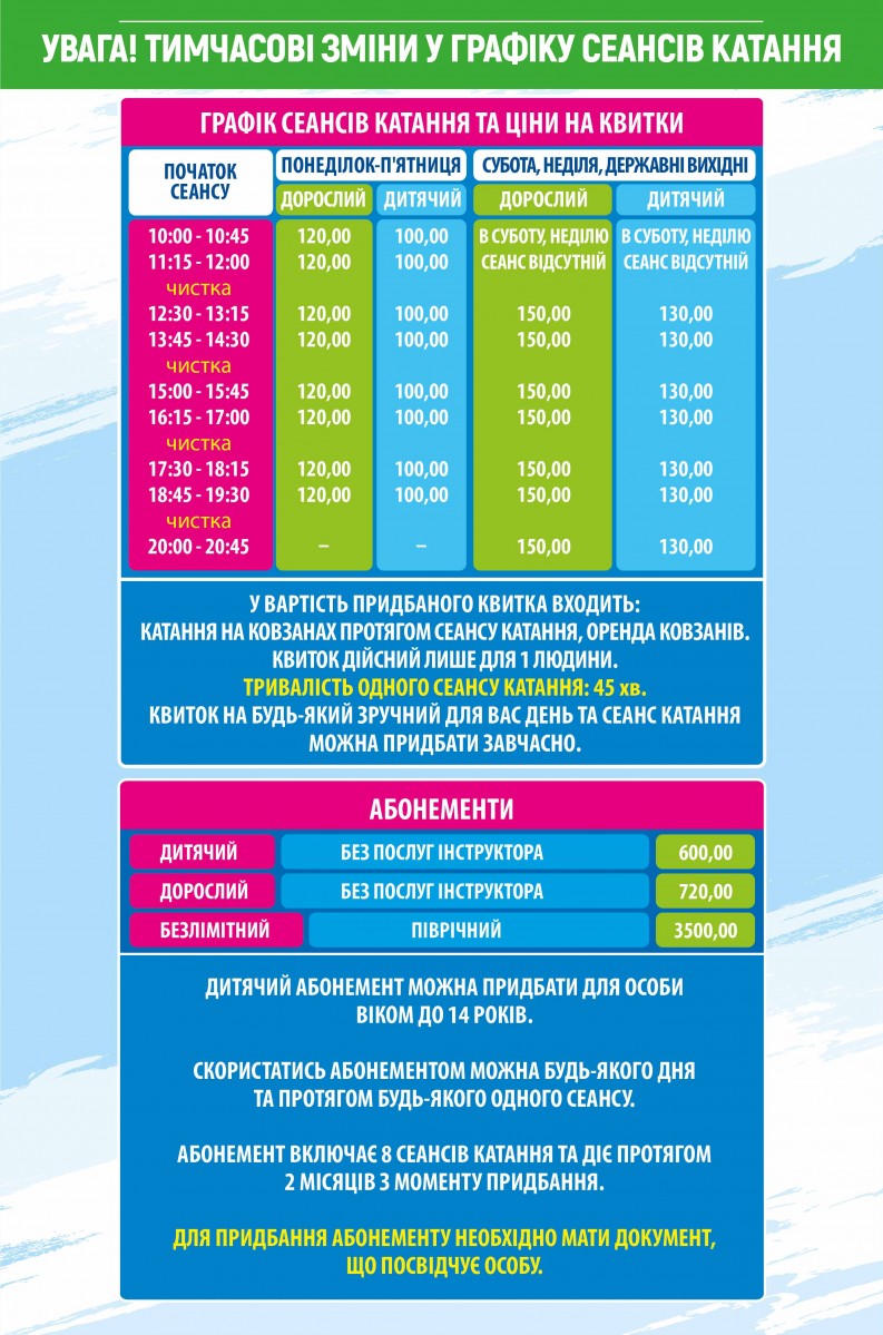 Уже від завтра графік сеансів катання буде змінено! Обирайте зручний час для себе упродовж всього тижня: