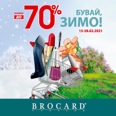 Акція «Знижки до 70%. Бувай, зимо!» діє у магазинах парфумерії та косметики BROCARD в Україні 15.02-28.02.2021. За умовами акції, на визначений перелік товарів надається знижка 30%, 40%, 50% або 70%, що вказана на цінниках. Під час акції не діють інші акції та знижки, в тому числі за дисконтними картками, при покупці з використанням подарункових карток знижка 30%, 40%, 50% або 70% діє лише при оплаті різниці між ціною реалізації товару без знижки та сумою номіналів подарункових карток. В акції беруть участь понад дві тисячі найменувань товарів. Деталі акції та перелік акційних товарів – у консультантів.