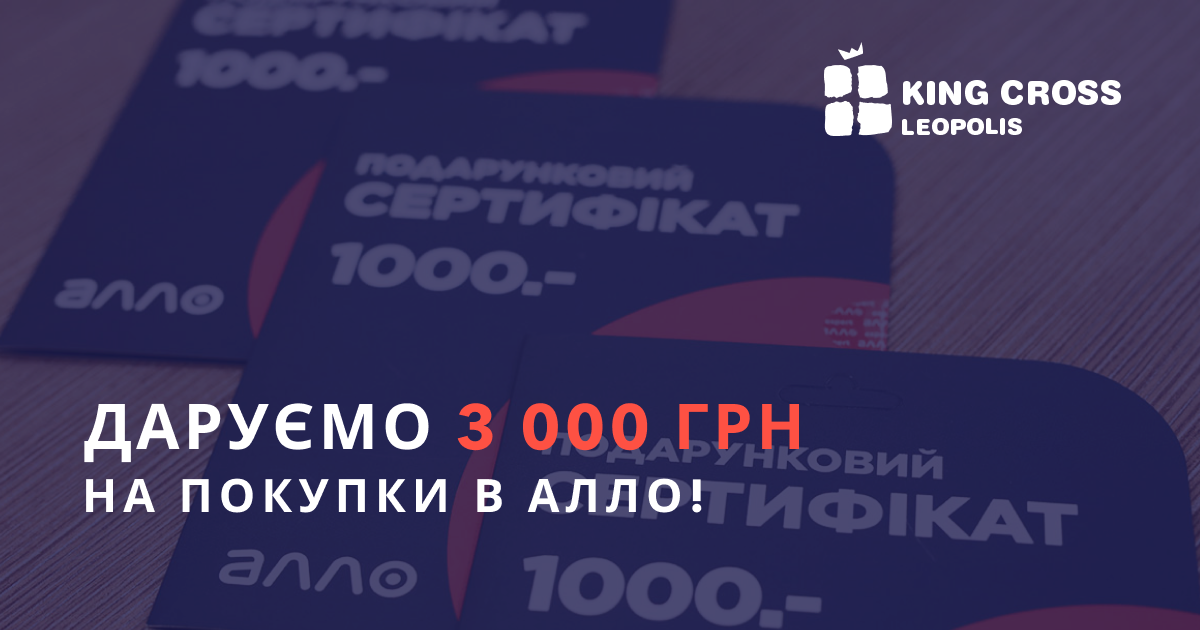 - зареєструвати чек у мобільному додатку King Cross Leopolis (у розділі "Розіграш" чи за кнопкою внизу акції з назвою Даруємо 3000 грн на покупки в АЛЛО!);