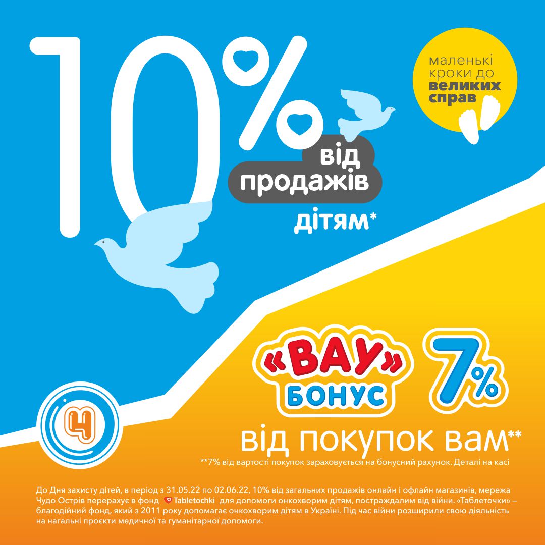 3 31 травня по 2 червня ми будемо перераховувати 10% від продажів фонду "Таблеточки" для онкохворих дітей, які постраждали від війни. Роблячи покупки в нашій мережі - пам'ятайте, що ми з вами творимо це добро разом заради майбутнього!